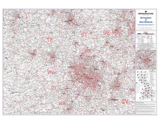 Birmingham & West Midlands Postcode Wall Map - Sector Map 13