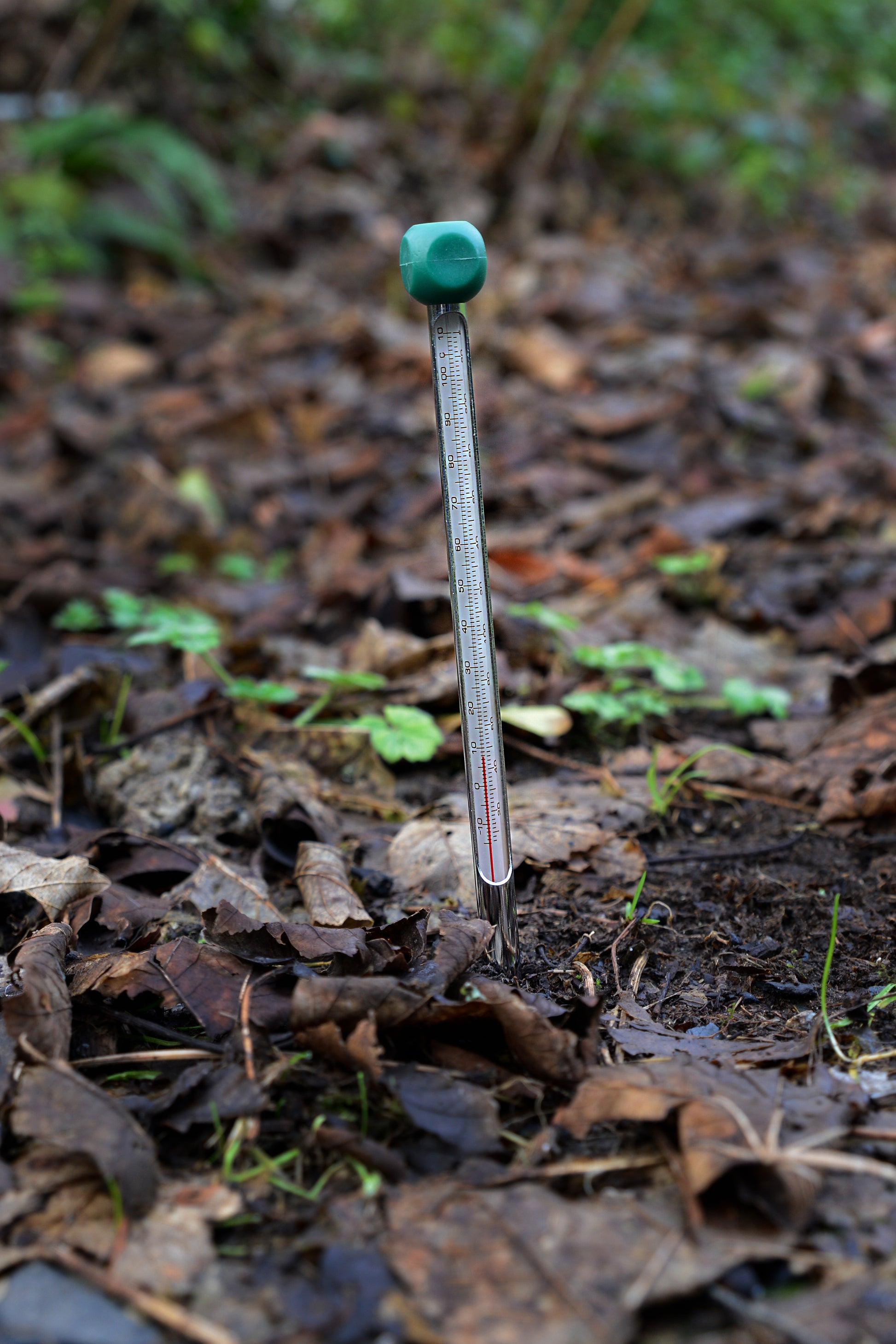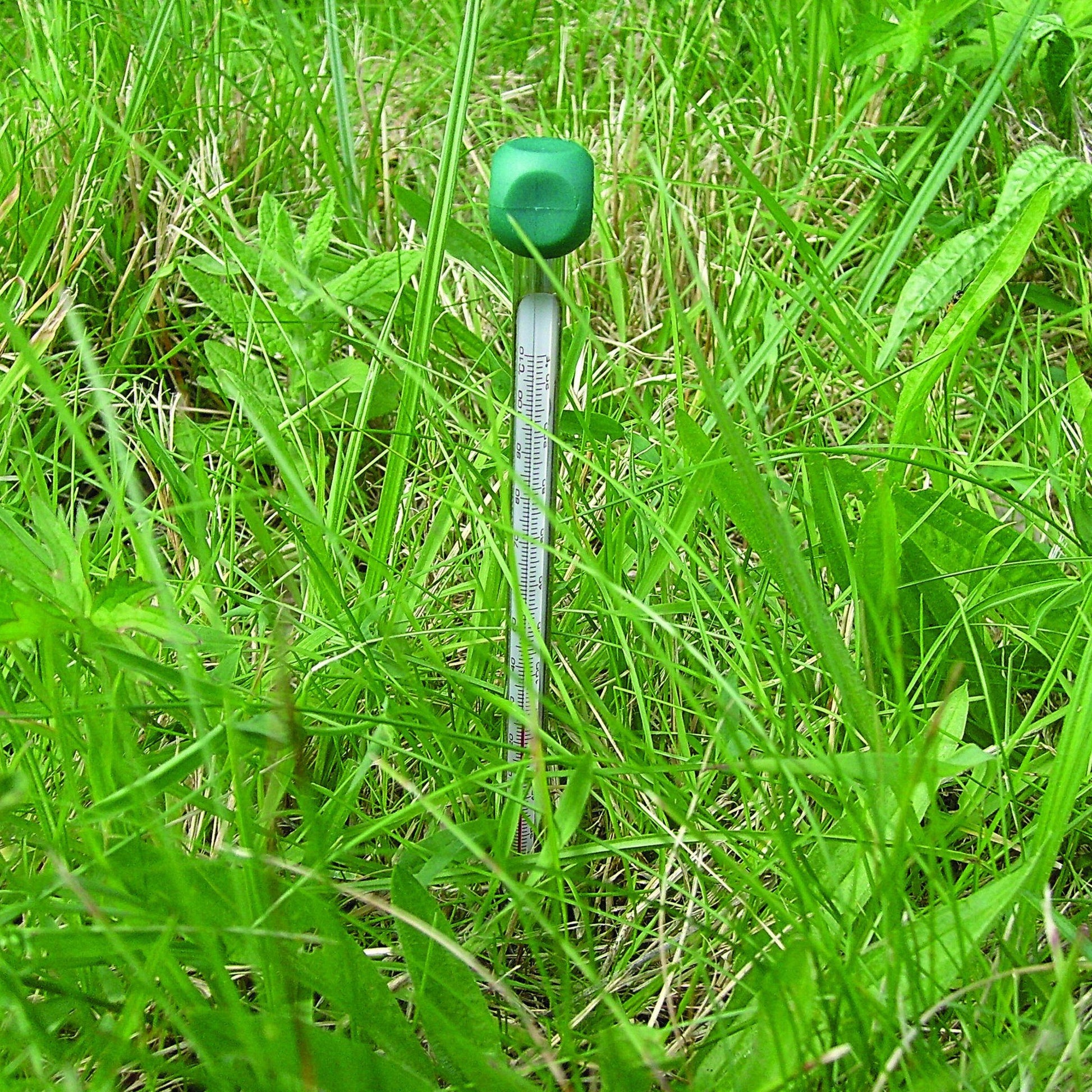This practical soil thermometer comes in a heavy tubular aluminium case and has a green ball handle.