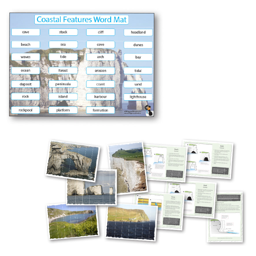 8 x A4 Coasts Photocards and Teacher’s Notes – A set of eight high-quality photocards featuring real-world images of coastal environments. Each card comes with detailed teacher’s notes to guide classroom discussions and activities, helping students explore the dynamic processes that shape coastlines, such as erosion, deposition, and human impact. These cards are perfect for stimulating conversation, deepening understanding and building critical thinking skills.