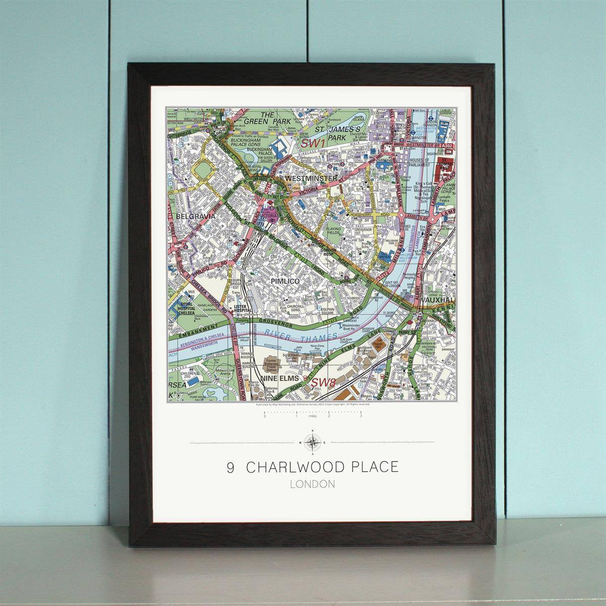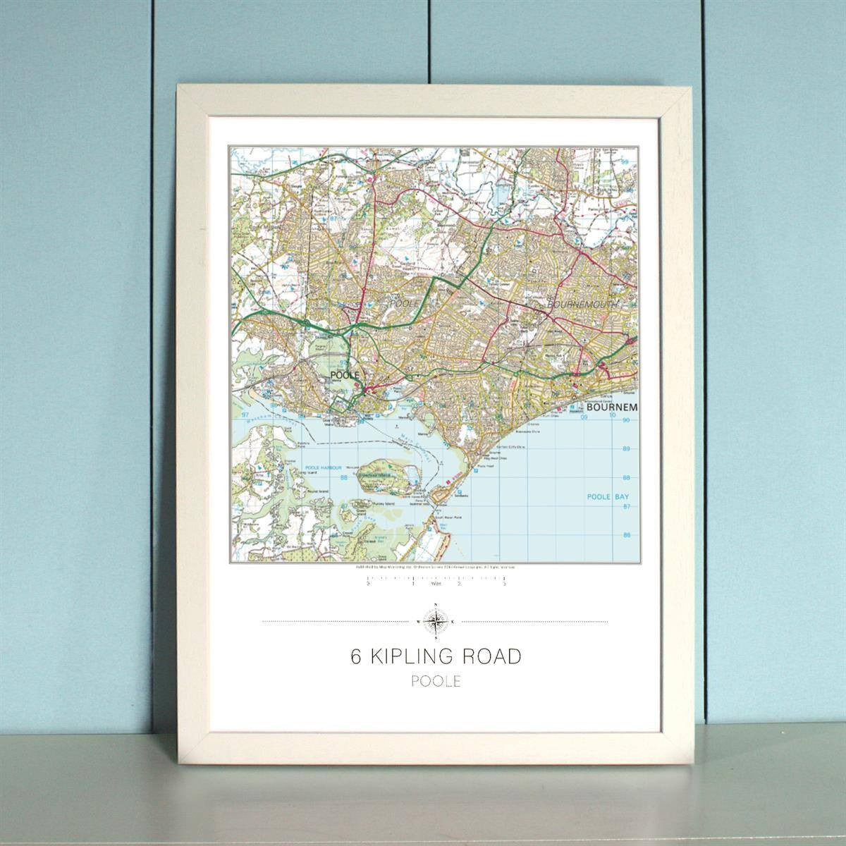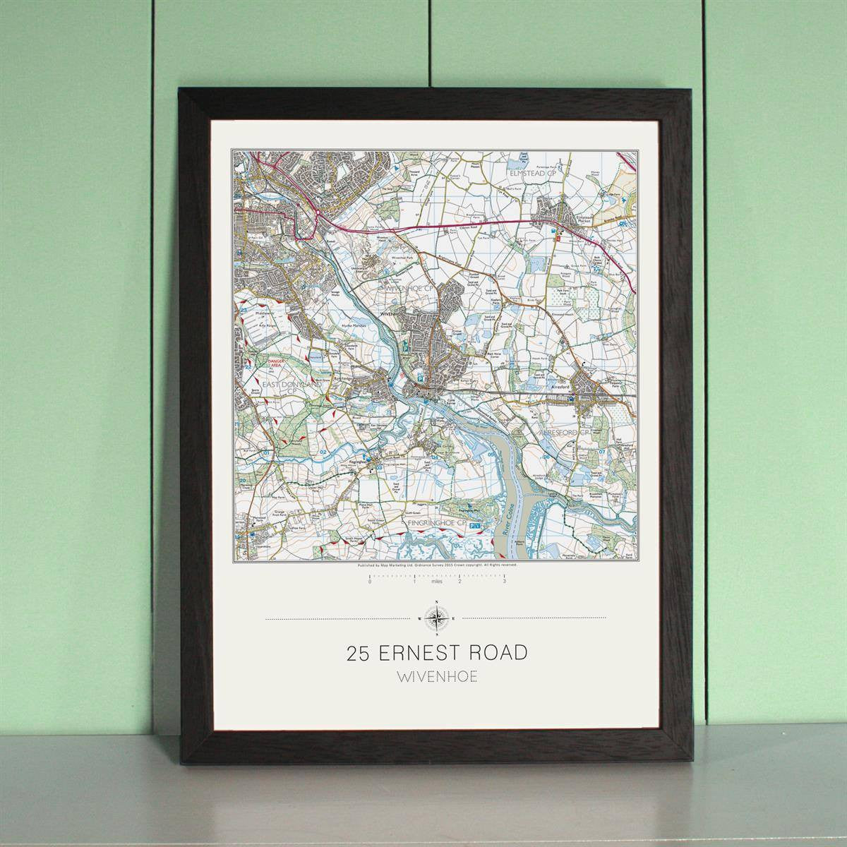 Put your home at centre stage! Simply give us your full address and postcode and we will produce this beautiful print of an Ordnance Survey® (Explorer or ) map or an Aerial Photo with your chosen location right in the centre of it. We then laminate the print, finish it in your choice of high quality wooden frame, and personalise it with the first line of your address and your postal town. Smart, stylish and informative, these framed maps or aerial prints make highly original and distinctive gifts for someone special. Or of course you could treat yourself...