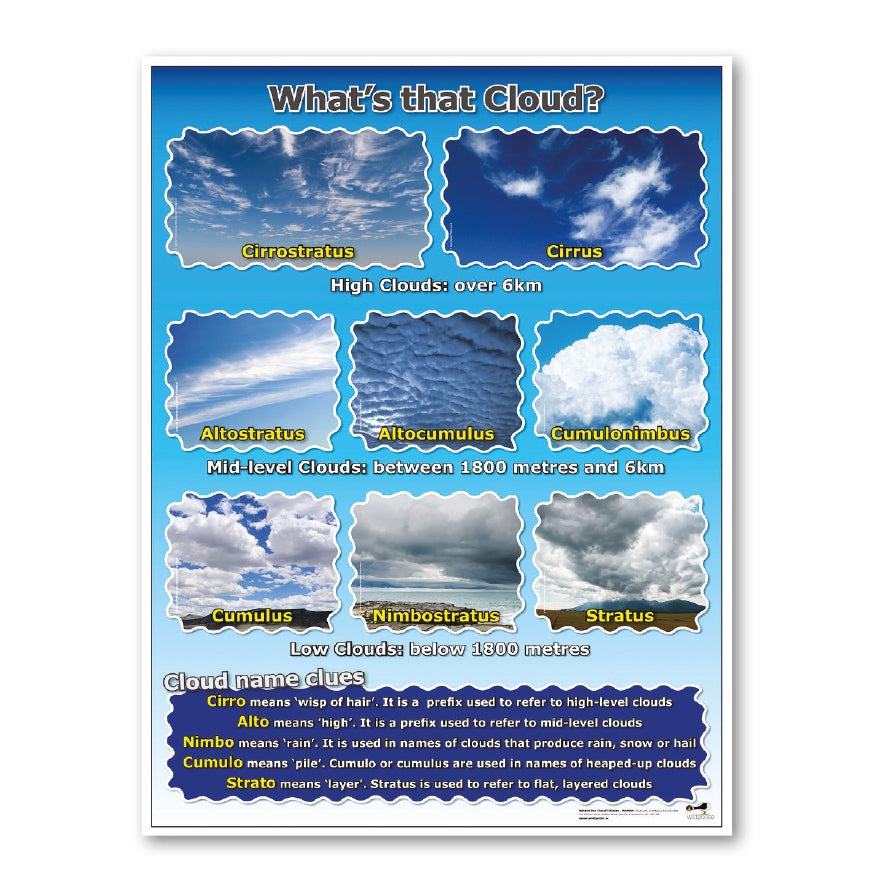 1 x A1 "What's That Cloud?" Poster – Start with the basics! Identify clouds and their role in the water cycle with this eye-catching poster. Who knew that clouds could be so cool?