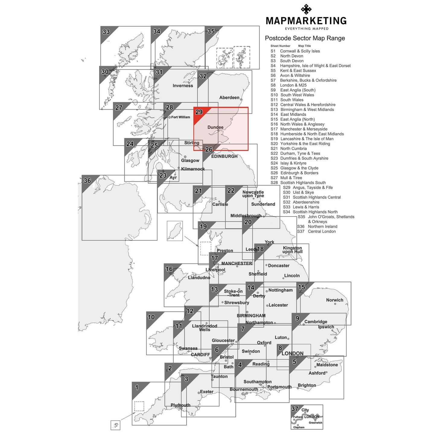 Angus, Tayside and Fife Postcode Wall Map - Sector Map 29
