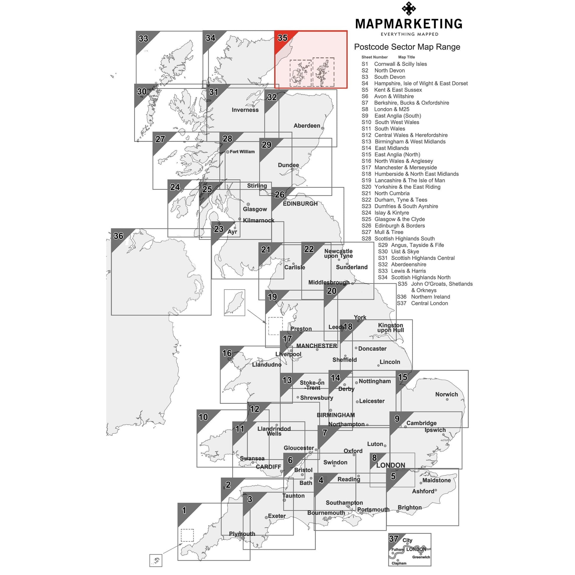 John O'Groats, Shetlands and Orkneys Postcode Wall Map - Sector Map 35
