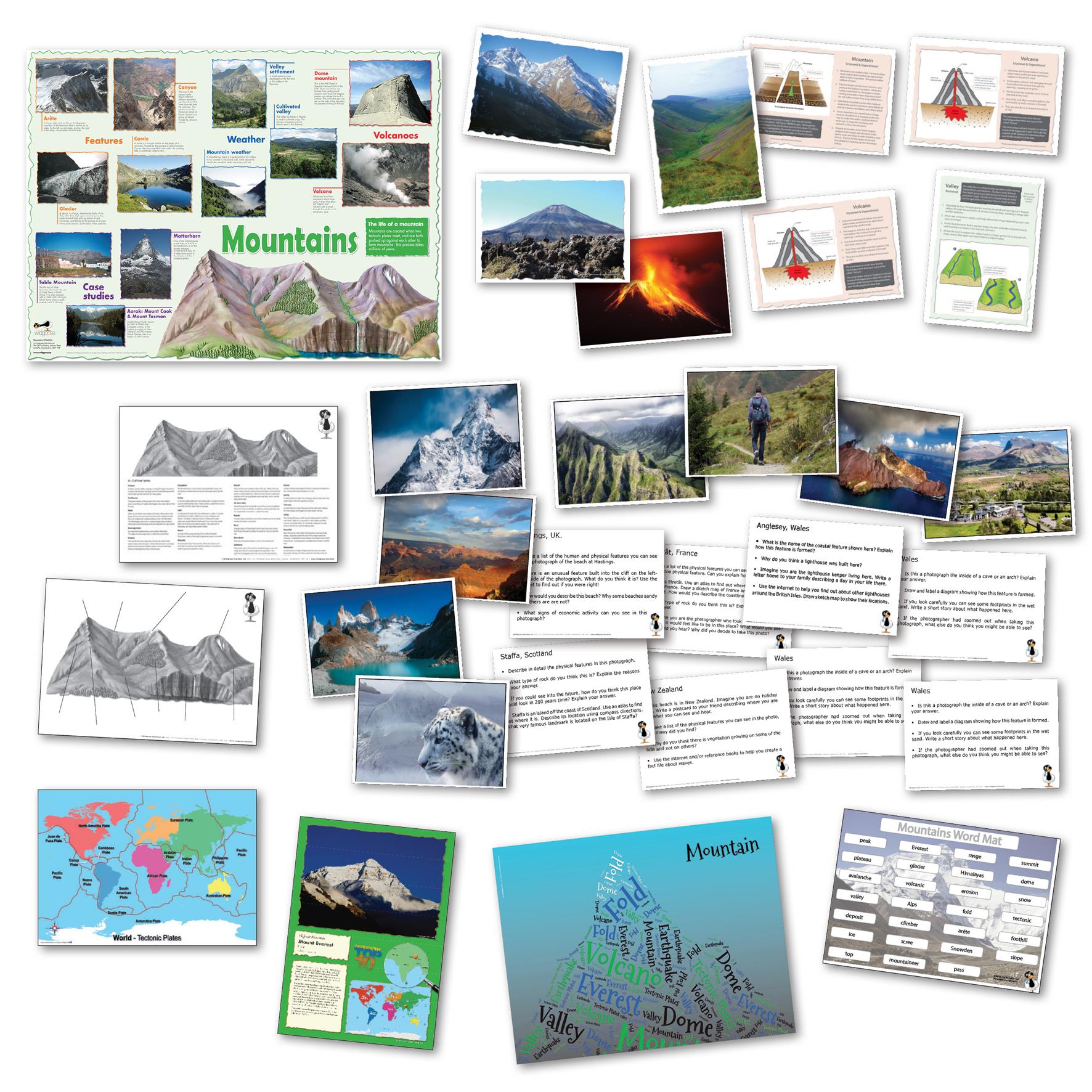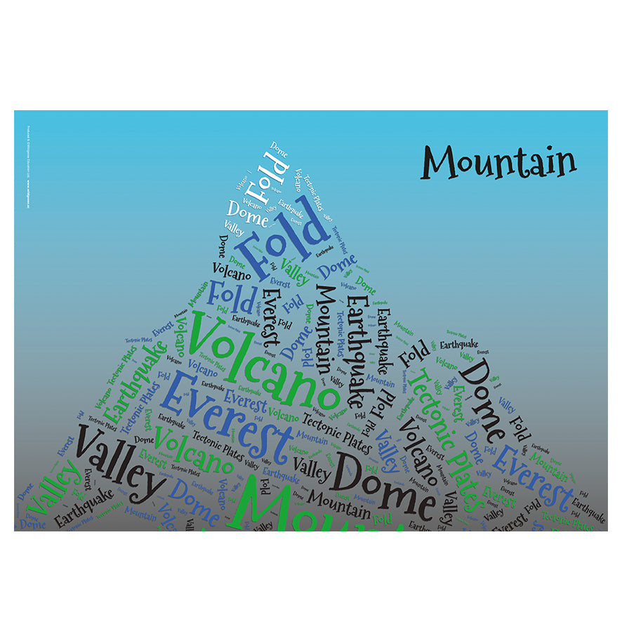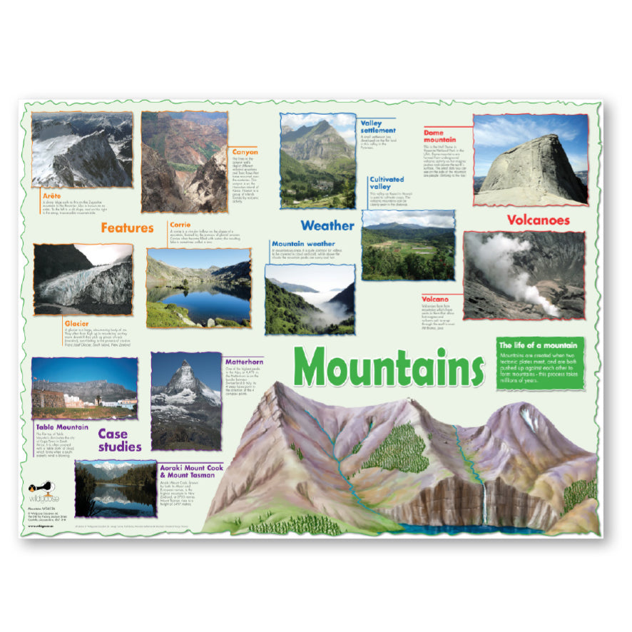 Mountains Poster (100cm x 70cm) – This large, vibrant poster features stunning images of mountain ranges, showcasing different types of mountains and key features such as peaks, valleys, and ridges. It’s a fantastic visual aid to bring the world of mountains into the classroom and help students grasp the concepts of mountain formation.