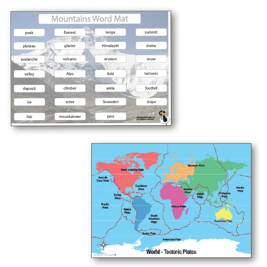 A3 Photocopiable Keywords Leaflet – A handy resource for reinforcing key geographical vocabulary related to mountains. This photocopiable leaflet includes terms such as “erosion,” “fault lines,” and “subduction,” ensuring students build a strong foundation of relevant terminology to use in their lessons.