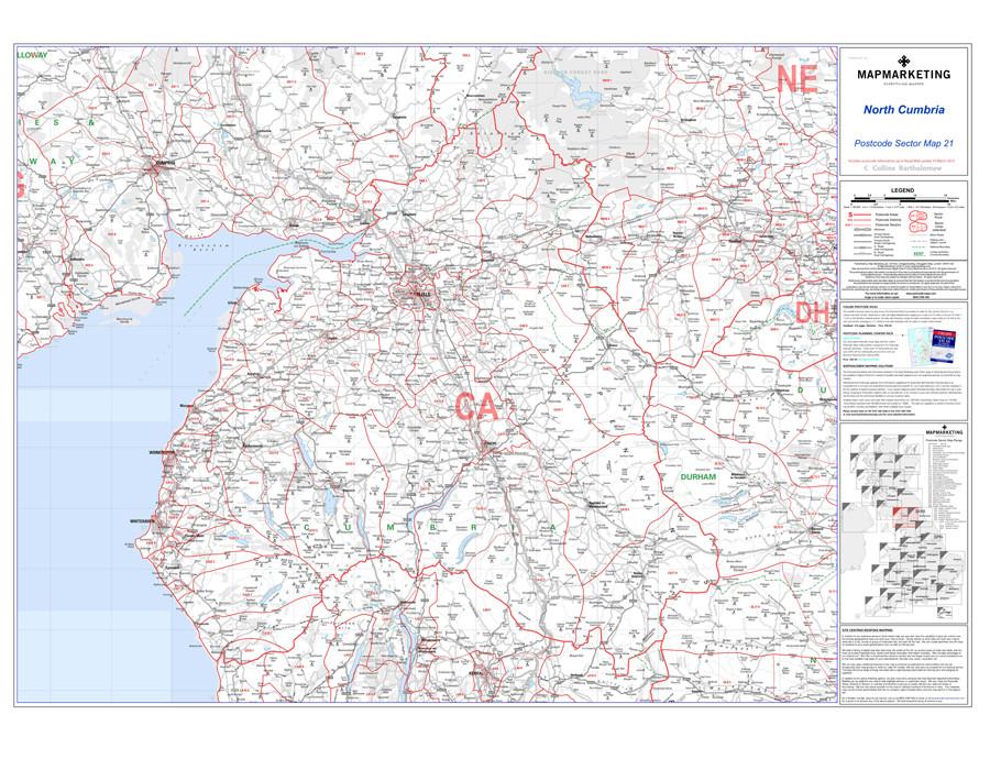 This is one of 37 pre-defined map sheets that covers the UK at Sector level displaying all of the first part of the postcode and the first number of the second part, or Inward Code, at a scale of an inch to 2.4 miles. This Sector map includes all of the postcode changes in the most recent Royal Mail Postcode Update. Area, District and Sector boundaries and numbers/letters are shown in red with County and Unitary Authority boundaries presented in green. The map base shows motorways, primary, ‘A’ and down to unclassified roads with conurbation shapes and city plan insets showing street level detail for major cities.