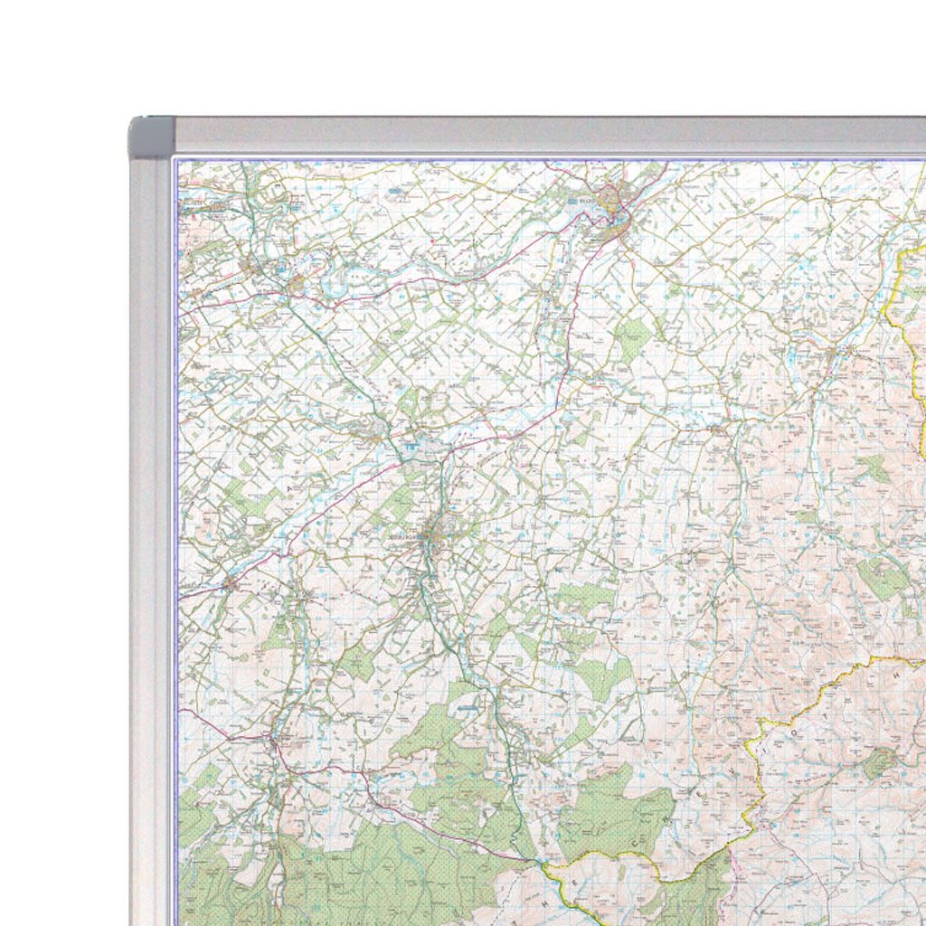 Mapping printed at the full 1:50000 scale, 2cm = 1km. The wall map shows the whole of the National Park area with additional space around the park boundary for context.Available in a durable encapsulated finish, supplied rolled. This lamination is ideal for use with non-permanent pens to write on, wipe off, perfect for route planning.