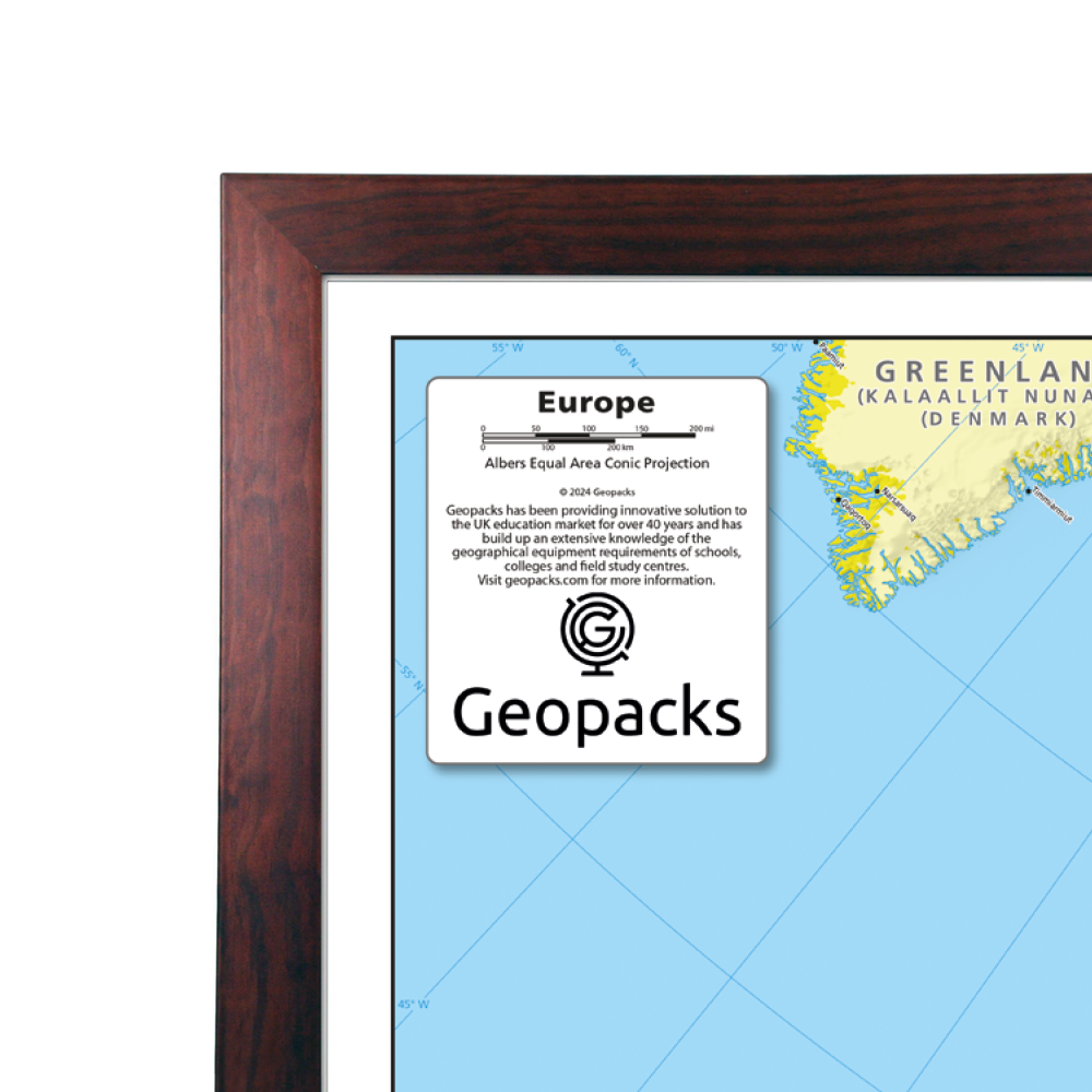 Our politically coloured map of Europe features countries marked in different colours, with international boundaries shown. All major towns and cities of Europe are featured within our huge map, and the countries capital cities are clearly marked. The map contains hill and sea shading adding to the vibrant overall effect.