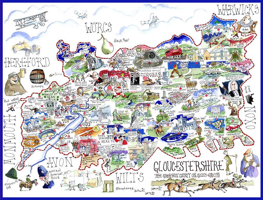 In this very funny map of Gloucestershire, you will find lots to amuse you! From weird goings on in Alvington, the rotten muggle step family of Harry Potter in Dursley and fossils at Bishops Cleave. You will also find the walking festival and the Cotswold olympick games.