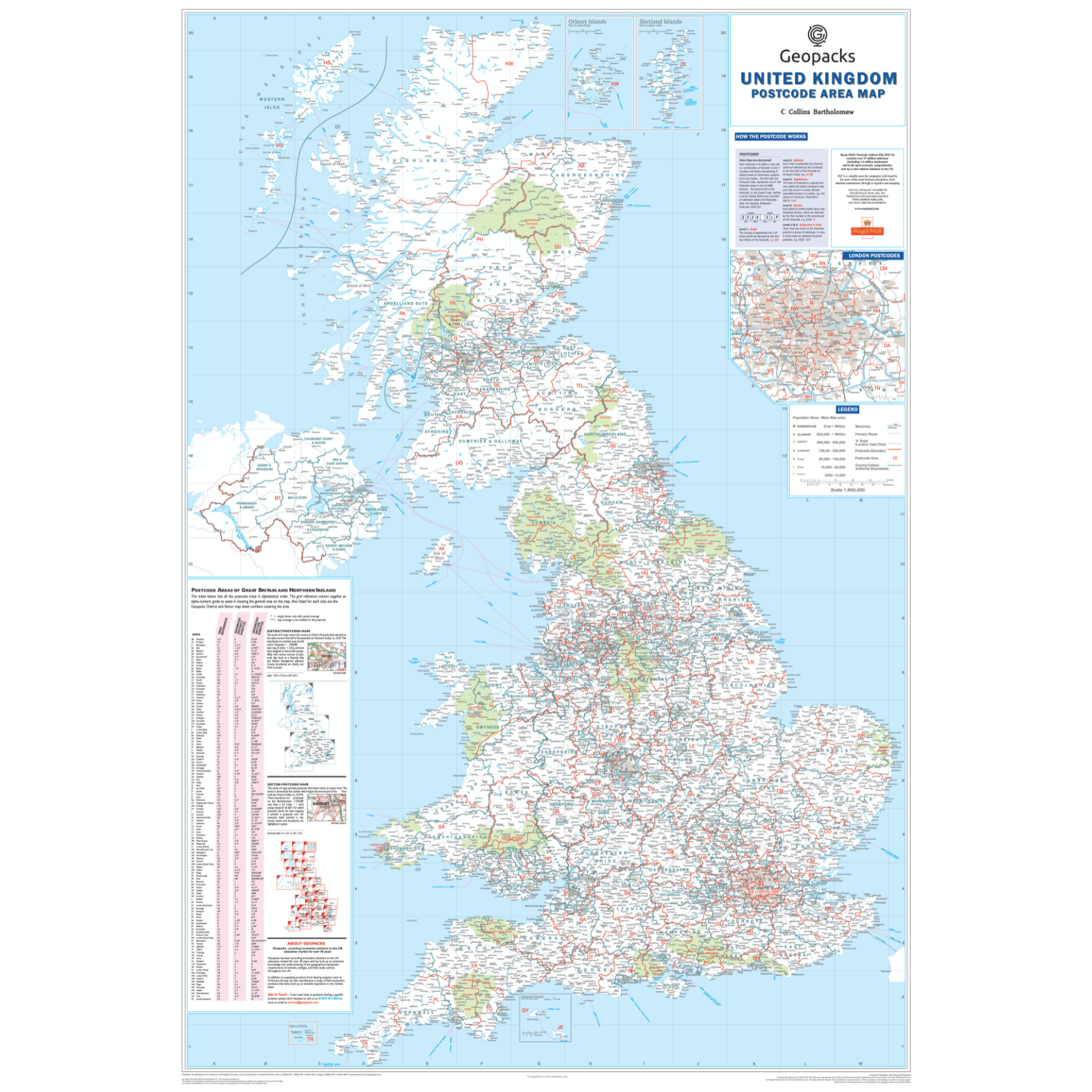 This map also features a handy index detailing all 124 Postcode Areas (including the name of each Area's main postal town/city) enabling users to locate rapidly an Area on the map. In addition, this postcode area map provides detailed definitions of the different levels of Postcode detail (Area, District and Sector) and how they are structured. Please Note: Our GB Postcode Area Map is updated and reprinted annually ensuring you receive the most current Area boundary information available.