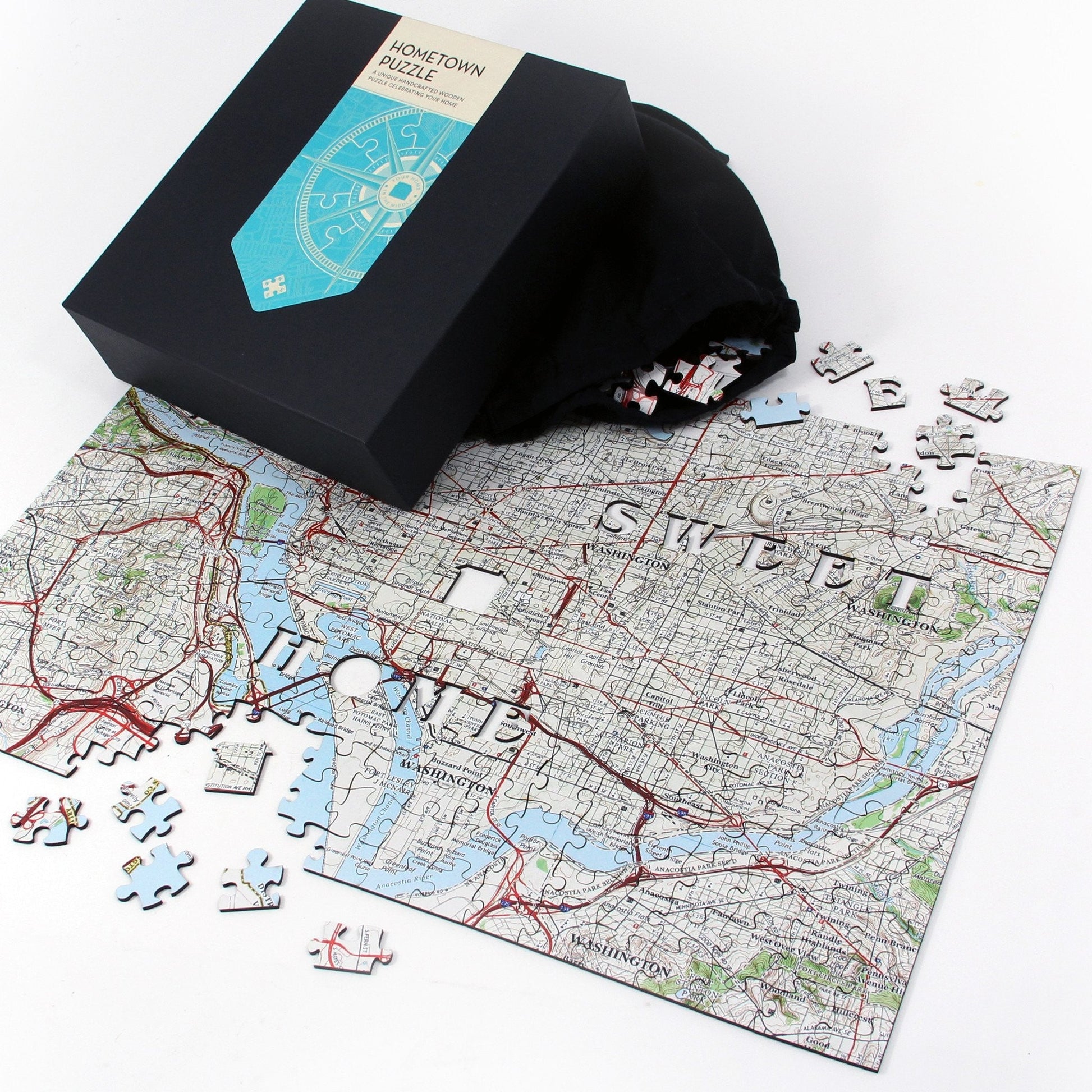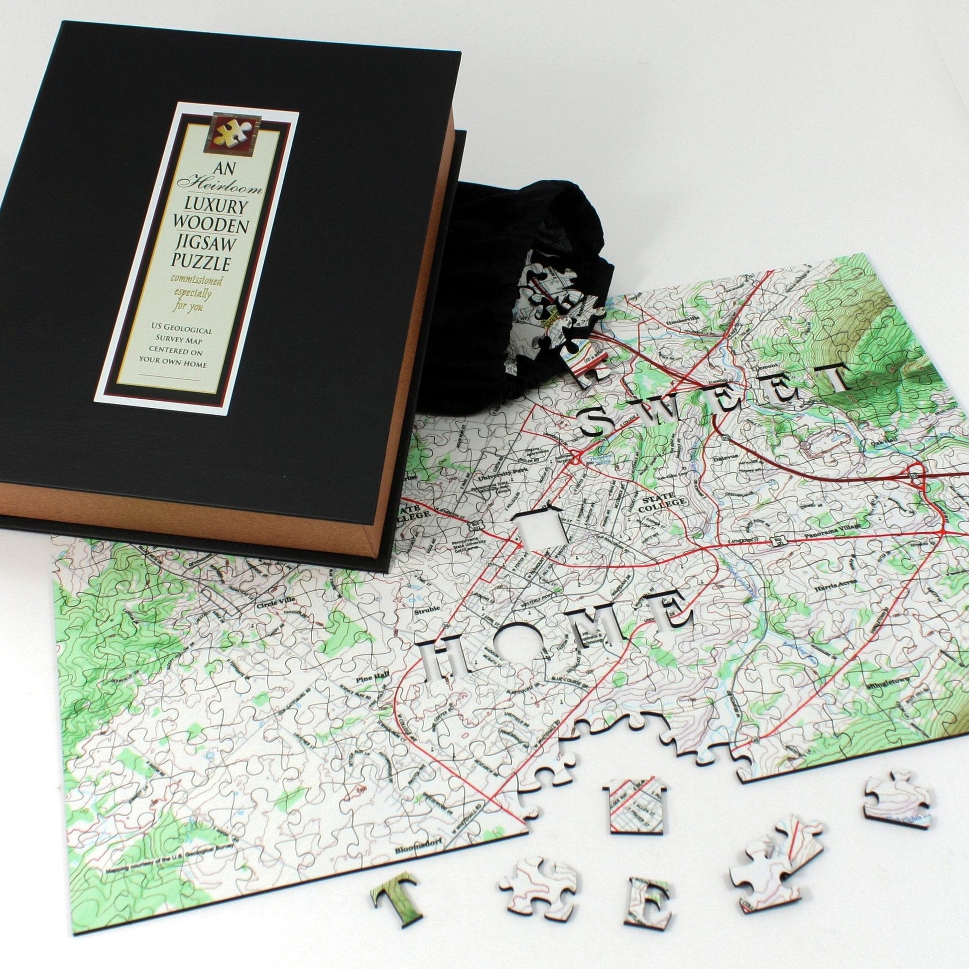 Unique, made to order 300-piece wooden jigsaw map centered on a chosen location. Put your house at the center of a puzzle!